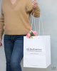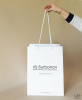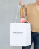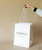 Вертикальный пакет из мелованной бумаги с матовой ламинацией с печатью логотипа (чёрный цвет). Ручки выполнены из белого полипропиленового шнура, с прозрачными стопперами, крепятся через белые люверсы.
