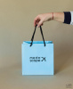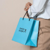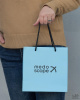 Пакет из мелованной бумаги с матовой ламинацией, с печатью логотипа с двух сторон и голубым фоном. Пакет внутри белый. Ручки выполнены из чёрного полипропиленового шнура, на чёрных стопперах, на чёрных люверсах.