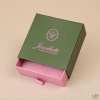 Коробка конструкция пенал из переплетного картона с оклейкой дизайнерской бумагой и тиснением, с петлей из репсовой ленты.