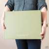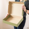 Самосборная коробка типа «самолёт» из бело-бурого гофрокартона. На крышки спереди нанесён логотип, зелёный фон – цифровая запечатка.